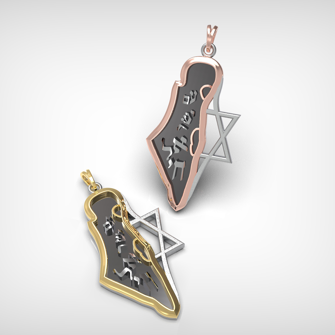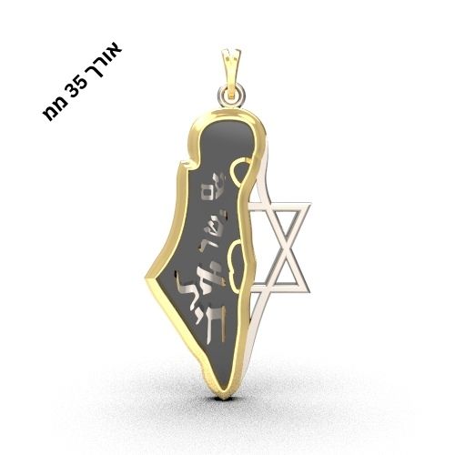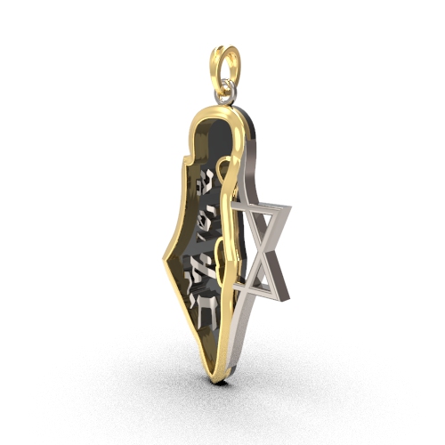 A 14-karat gold pendant designed in the general shape of the borders of the State of Israel, with the Star of David symbol combined with the inscription “Am Yisrael Chai”. This is one of the versions that combines a contemporary Israeli patriotic motif with the ancient Star of David symbol. A combination that has recently become a trend in itself and serves as a substitute for the overt use of the Jewish Star of David known among Jews in the Diaspora who fear an anti-Semitic environment.