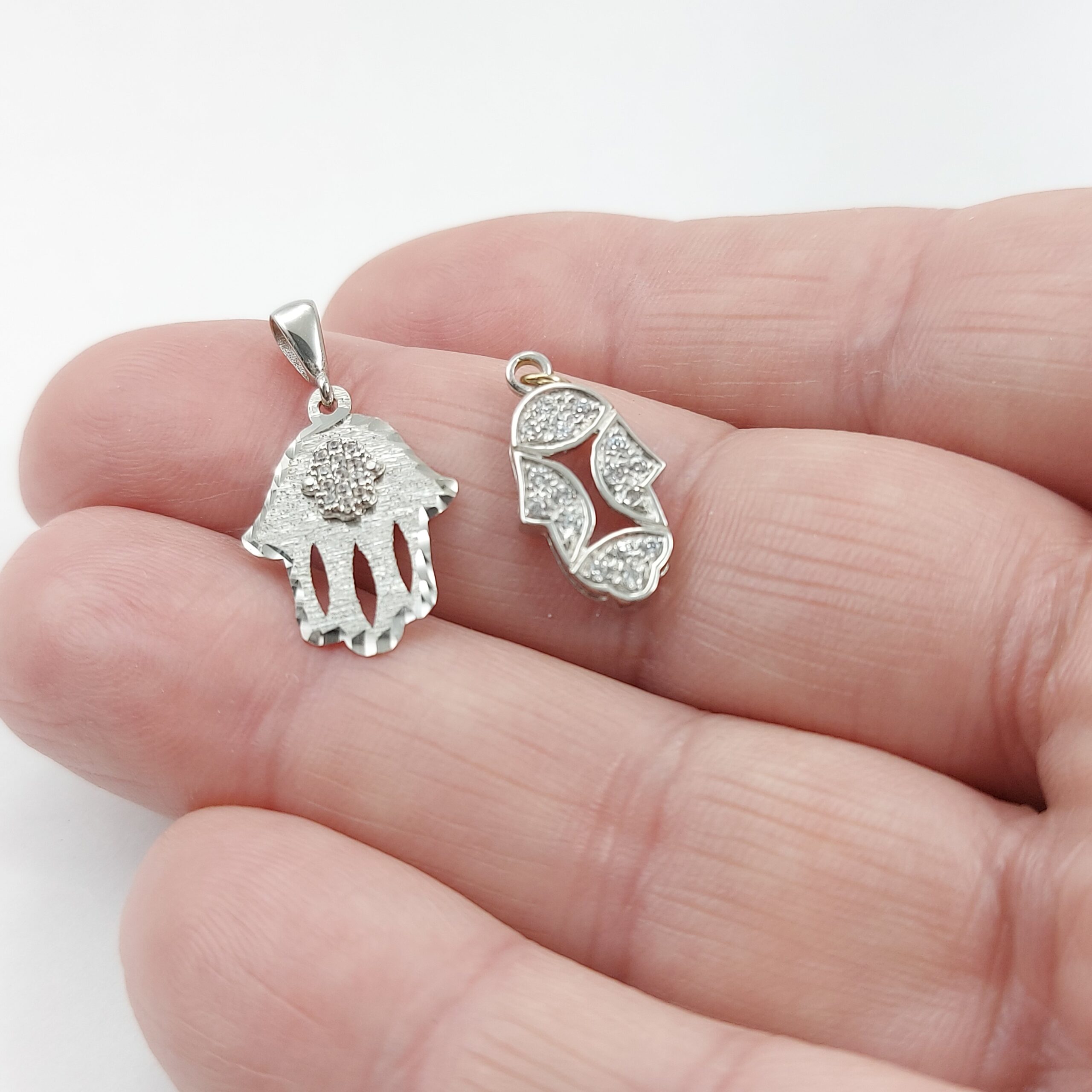 A white gold pendant, K14, weighing 1.1 g, is shaped like a Hamsa, shaped like a pair of hands during prayer, and set with natural zircon stones.