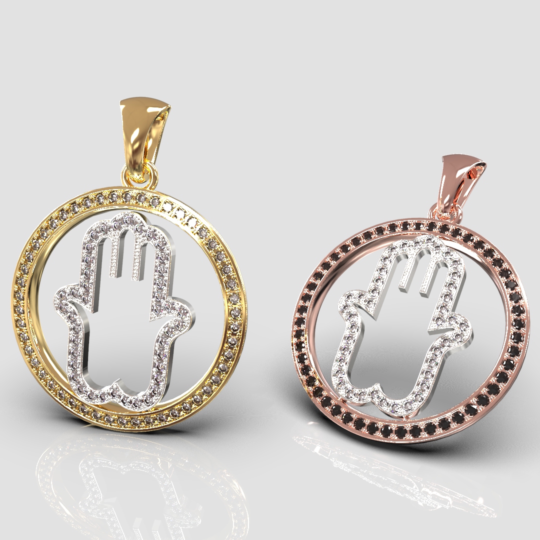 Hamsa pendant made of 14 karat yellow gold set with zircons, weighing 2.60 grams. The model is built in a traditional design, which combines the symbol of an open palm with the fingers pointing upwards, to the sky, and surrounded by a bounding circle. This is a symbol that was used in the Jewish legacy as a personal amulet for protection that keeps away the evil eye and also protects within the community or family. Suitable as a gift for men and women. Can be ordered in different sizes according to the customer’s budget.
