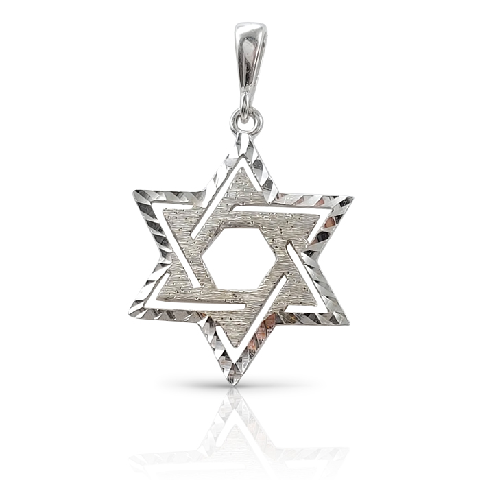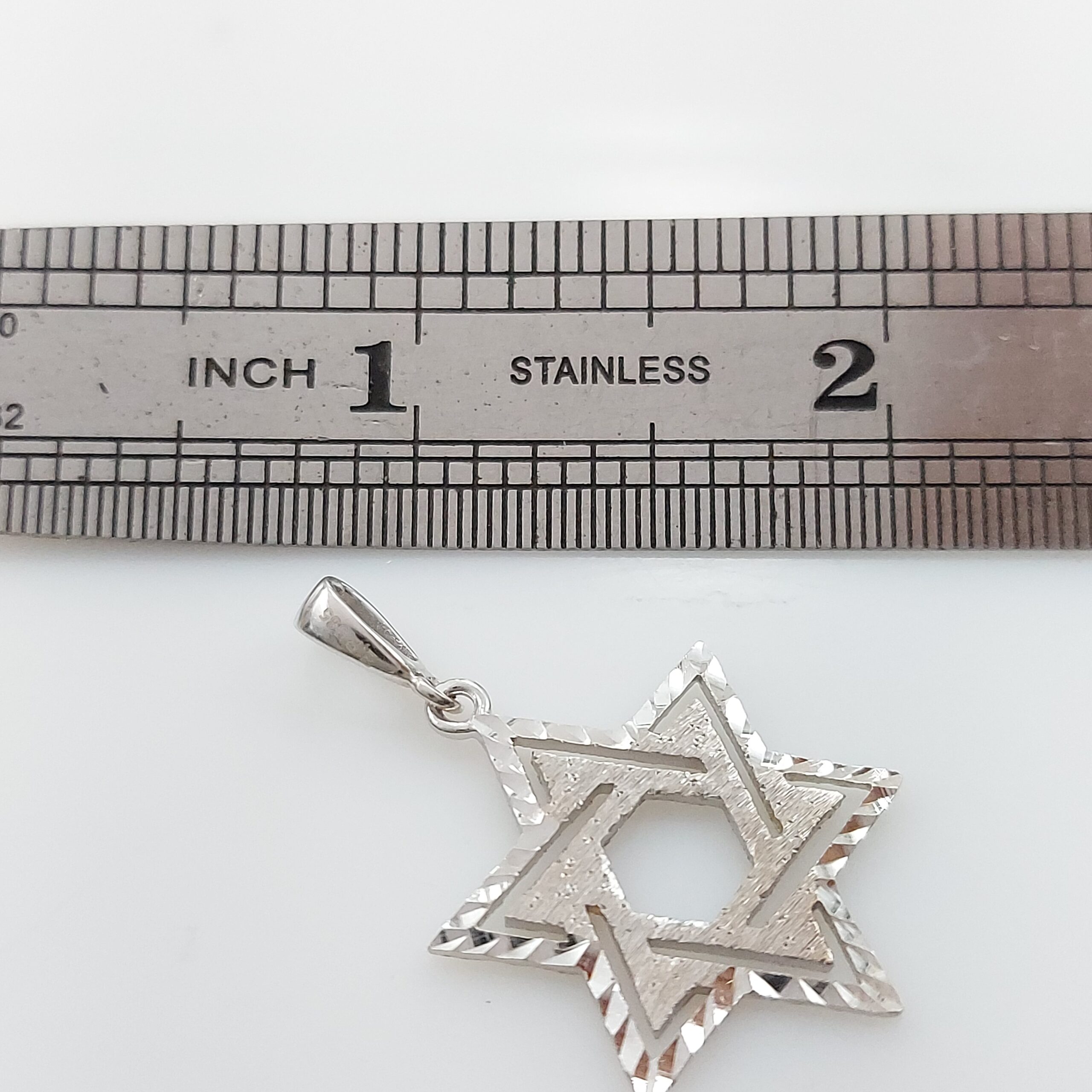A pendant in the design of a Star of David made of 14k white gold that weighs 2.5 grams.