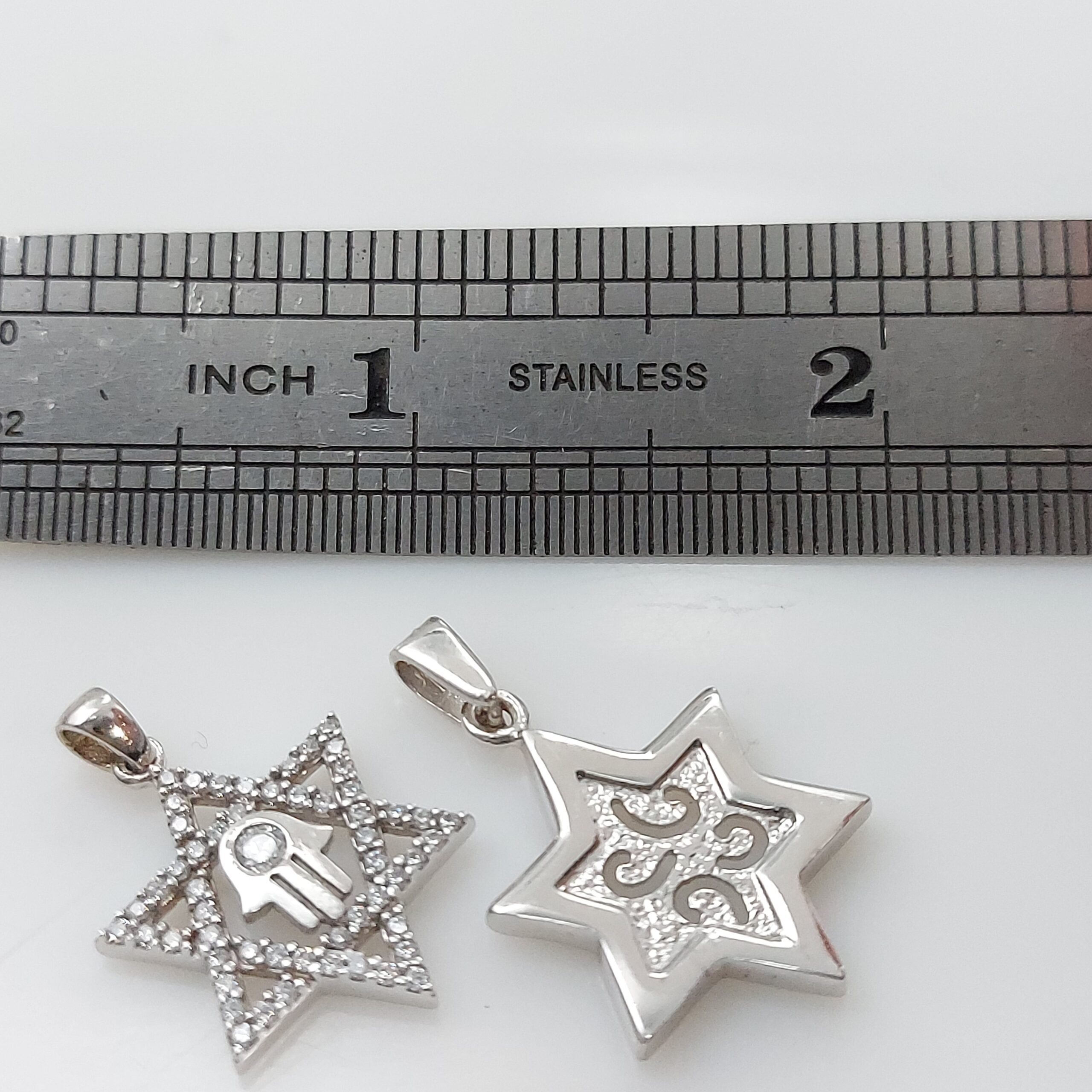 Weight 1.92 gr.   The Star of David pendant is designed in a classic structure of two equilateral triangles made of gold and white that embraces a small Hamsa pendant with a sparkling zircon stone in the center. The stone in the center of the Hamsa symbolizes the guardian eye of the God that keeps away diseases and evil deeds.                       The pendant is studded with 53 zircon stones.